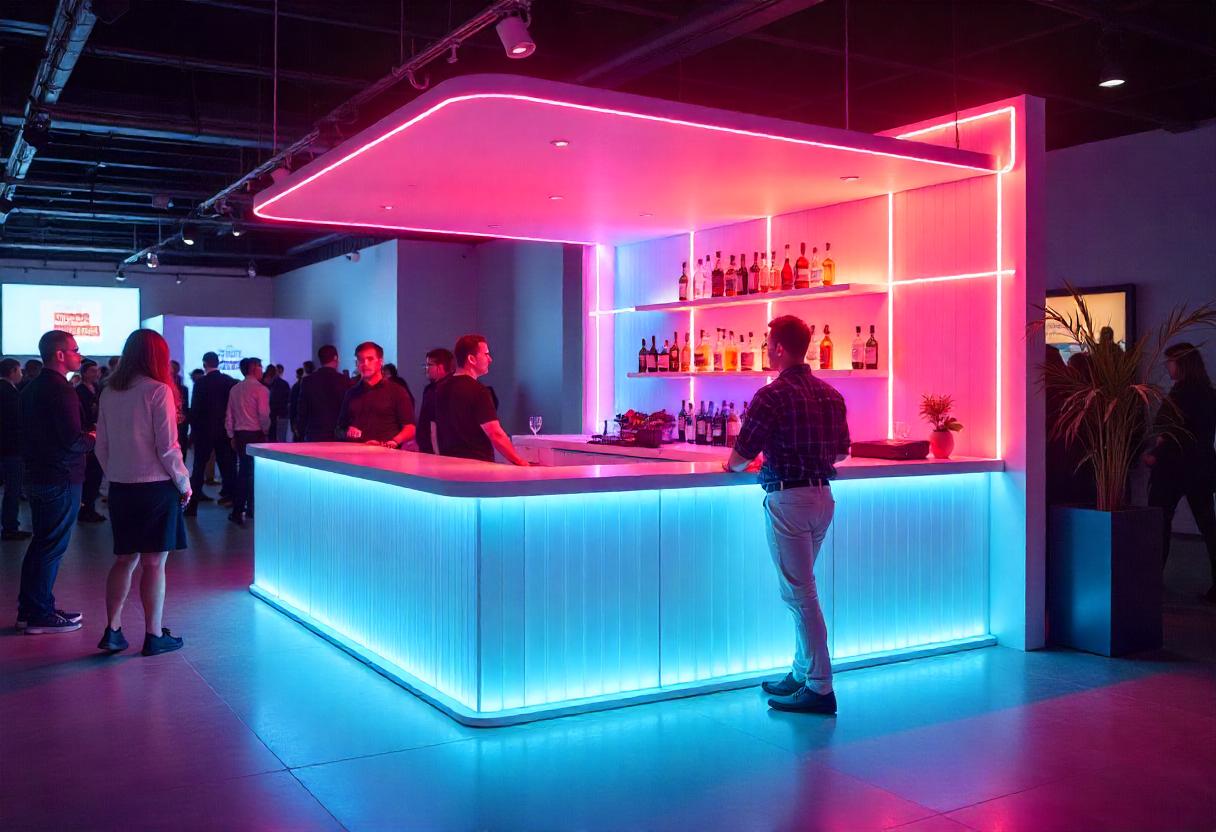 Trendy bar setups with ambient lighting for events. We create immersive experiences that elevate any event atmosphere.